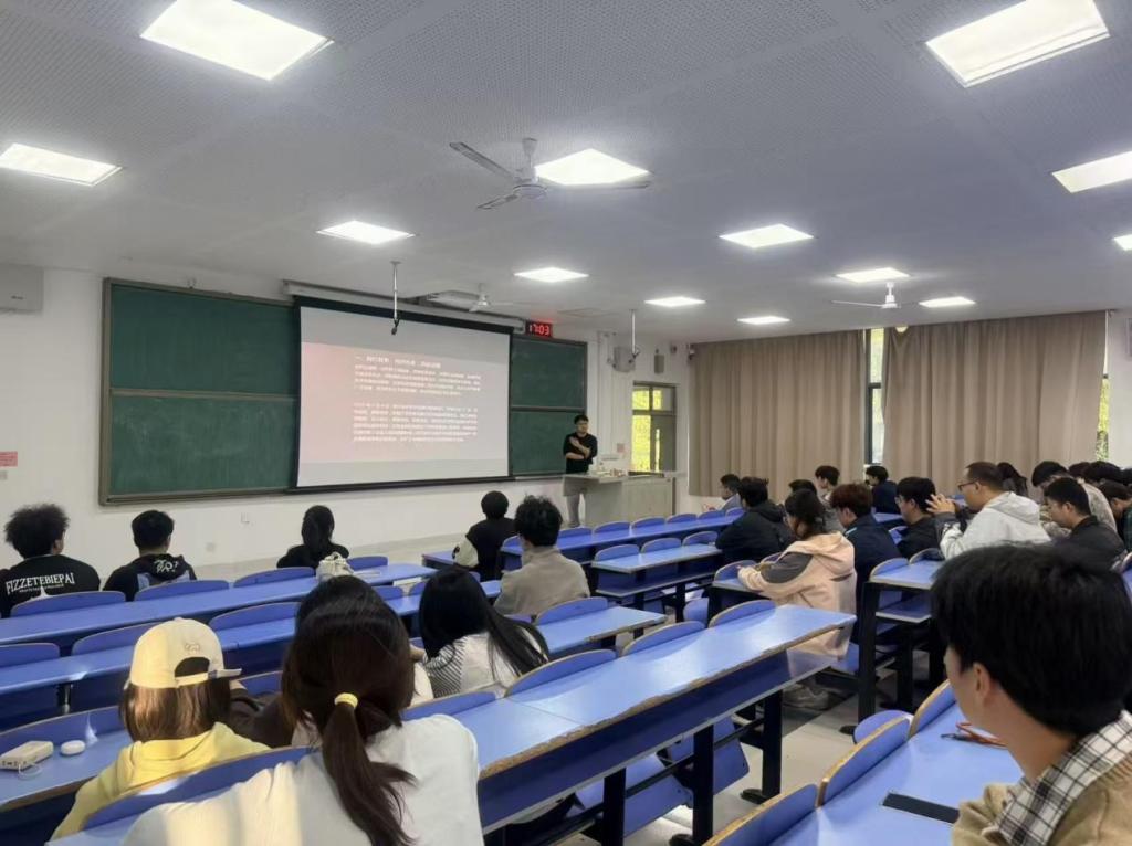 尹旭围绕五四运动历史回眸、历史进程、精神内核、时代传承四个板块展开系统讲解。他在回顾了五四运动爆发的时代背景后,详细介绍了五四运动从北京学生运动,发展到上海工人罢工、商人罢市的全民抗争历程,阐明五四运动的重要意义。在精神解读环节,他强调,“五四精神”以爱国为核心,包含民主、科学、进步四大内核,是激励一代又一代中国青年奋勇向前的精神旗帜,号召同学们将个人理想融入国家发展大局,以勤学、修德、明辨、笃实的实际行动,传承红色基因,勇担时代重任。