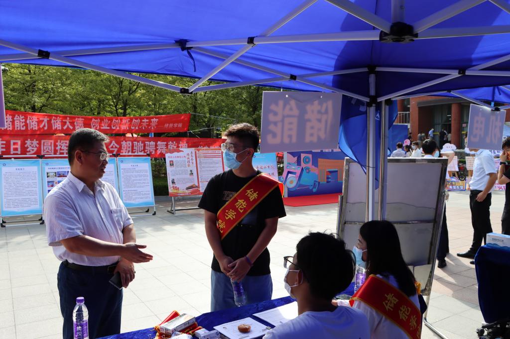 学院领导在迎新点跟工作人员交流